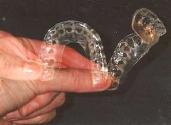 hard acrylic material. It softens slightly in warm water, or in the mouth, thus conforming more readily to tooth contours. As it cools, it returns to the processed state, thus maintaining fit integrity. The thermo elasticity allows it to gain retention by engaging the lingual and buccal interproximal spaces, and maintain retention from the lingual and buccal undercuts formed naturally by the teeth. The slightly softer material gives added comfort to the patient and requires minimal adjustments, reducing chairtime for the dentist.